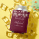 An elegant burgundy wedding favour can cooler featuring pretty string lights, stylish signature script names and special date set in modern typography. Designed by Thisisnotme©