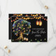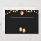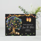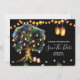 A wonderful and vibrant illustration featuring a large oak tree filled with faux shining hanging lanterns and string lights set against a midnight black background. The top and bottom edge have oval wicker rattan baskets that are illuminated against the night sky. Small green leaves are scattered below the tree and white templates appear to the right of it for your personalised details. These are ideal for rustic country fall / autumn, summer, spring or winter "save the date" announcements. These luxurious and elegant flat cards will delight your guests.