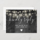 A string lights rustic black wood barn boho RSVP card with chic typography. The reverse features your details and a fun guest song request. Designed by Thisisnotme©