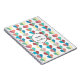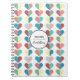 Sweet string of hearts design notebook in dusty pinks, reds reds, blues and yellows with customisable text.
