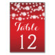 String of lights and white snowflakes red winter wedding table number place card featuring white twinkle glowing string of lights with white snowflakes on the top on red gradient background. This modern and trendy wedding design is part of a wedding set or collection, is fully customisable and is perfect for a winter Christmas wedding. Some elements courtesy of vectorportal.com.
