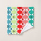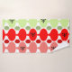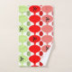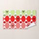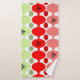 This towel set has a mid-century modern design of ovals in red, pink, green, and blue strung together in vertical lines with starbursts scatter among them.