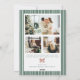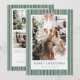 Wish friends family Happy Holidays with a personalized vintage Christmas photo Christmas card showcasing your family on the front over a watercolor green striped pattern topped with a red and green Christmas bow, and a back side with 3 family pictures and an editable note.