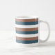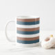 Do you like pretty mugs? This mug has a pattern of brown, teal and white stripes.