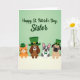 Designed with a soft light-green gradient filling the top portion, this St. Patrick’s Day card sets a sweet, friendly tone with a gentle holiday greeting centered near the top in flowing green lettering 💚. Beneath the text, four cozy animal friends lean over a wide white horizontal edge, their faces close together as if sharing a quiet joke. On the left, a striped orange cat wears a small green bowler hat, tilting slightly toward the group in a companionable pose. Next is a brown long-eared dog in a tall green top hat with a gold buckle, angled forward like it’s eager to join the conversation. A gray-and-white dog with alert ears and a green bow tie stands in the middle, looking calmly ahead as though keeping everyone together. On the right, a fawn-colored dog with a flattened snout and wide eyes wears a tiny green top hat, its gaze turned toward the others with an affectionate, friendly look ☘️. The white band runs straight across the lower section, with the four heads and hats peeking just above it against the pale green background.