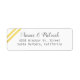 Your address personalised in a easy way... in a nice white label with two lines of text aligned by centre, and with bride and groom names written in a stylish script font, with elegant detail of two faux gold diagonal stripes