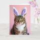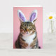 This design shows a striped tabby cat centered in the frame, looking straight out with a steady, inviting gaze that feels like a quiet hello between friends 🐇. Soft white bunny ears sit on its head, with pale lavender lining that adds a gentle touch of springtime color. The cat’s chartreuse-green eyes catch the light, giving them a glossy sparkle that draws you in. Warm browns, deep grays, and creamy tones ripple through the fur in detailed stripes, while a bright white patch on the chest sets off the darker markings. A small pink nose and long whiskers add to the tender, close-up portrait feel, like the cat is posing for someone it trusts. Near the top, a short Easter greeting appears in a simple, rounded font, set in lavender to match the ear interiors 🌷. The background is a smooth pastel pink with soft, diffused lighting that highlights the plush texture of the ears and the fine whisker lines.