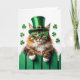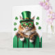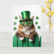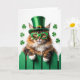 Designed with a majestic long-haired tabby cat as the main focus, this St. Patrick’s Day scene feels like a friendly wink between you and a favorite pet 💚. The cat’s warm brown and ginger fur, lined with rich black stripes, is shown in crisp detail as it leans forward with front paws resting on an emerald green picket fence along the lower third. A bright green top hat with a gold buckle sits above its calm, composed face, giving it a leprechaun look without stealing attention from its golden eyes. Oversized green glasses frame that steady gaze, making the cat look like it’s sharing a private joke with whoever’s on the other side of the card ☘️. The background is luminous white, dotted with small emerald shamrocks that float around the cat like confetti. For the text, place “Happy St. Patrick’s Day” centered near the top in deep green, with a smaller line like “Lucky to have you” in gold just above the fence. Share St. Patrick’s Day sentiments with someone you care about.