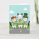 This card shows three white cats with black ears and tails standing together on a gray road marked with short yellow dashes, like they’ve paused for a friendly photo on St. Patrick’s Day 💚. Behind them, a bright green lawn stretches into a calm blue sky with a few puffy white clouds, giving the scene an easy, sunny feel. The left cat wears an orange cone-shaped hat, leaning slightly toward the others as if trying to stay close. In the middle, the cat’s green bow tie draws your eye, and its gentle smile and rosy cheeks suggest a sweet, affectionate bond with its companions. On the right, the cat sports a tall green leprechaun hat with a golden buckle, standing a touch taller like the proud organizer of the moment ☘️. Across their paws are three green signboards that read “Happy St. Patrick’s Day,” with “Happy” on the left, “St. Patrick’s” in the center, and “Day” on the right in lighter lettering. Small golden-yellow shamrocks decorate the “Happy” and “Day” signs, and the hats and accessories pop against the simple sky-and-grass background.
