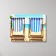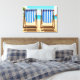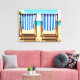An illustration from a photograph of two blue and white striped deckchairs on a beach themed background printed on a canvas.