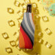 This bottle cooler has a striped design on it.