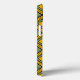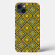 This phone case has an art deco design of diamond shapes with diagonal lines and colored diamonds in shades of green and yellow.