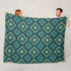 This large fleece blanket has an art deco design of diamond shapes with diagonal lines and coloured diamonds in two shades of teal.