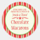 Cute green and red striped baking stickers, perfect for christmas cookie exchange parties or for selling your homemade products at farmer's market's and craft fairs around Christmas time. Use these stickers to seal your Christmas presents that you give others or for children's favours to family and friends. Currently reads Made with love from the kitchen of Jessica Claus' Chocolate Macarons. Fully customisable to personalise with your own name, and product details. Uniquely designed by Sarah Trett.