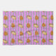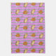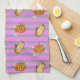This kitchen towel features watercolor coffins and jack o' lanterns with ghosts coming out set on a fun pale purple and grey striped background.
