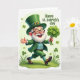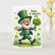 This card shows a smiling leprechaun-like character posed mid-step, as if he’s dancing toward you with an inviting arm outstretched. He has a round, open-mouthed grin, rosy cheeks, round glasses, and a full white beard that softens his face in a friendly, almost flirty way 💚. His outfit is layered in shades of green, including a tall hat with a gold buckle, a fitted jacket, and matching breeches. Blue-and-green striped socks peek out above brown shoes, each shoe finished with a shiny gold buckle that catches the light. In one hand he holds a big bunch of shamrocks ☘️, clustered thickly like a bouquet you’d give to someone you’re fond of. The background is a gentle green glow with small shamrocks floating around and a few thin blades of grass near the bottom. In the upper right, the words “Happy st. Patrick’s day” appear in darker green lettering against the lighter green background.