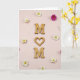 This design shows an overhead scene on a soft pale pink background with a faint linear texture that feels calm and intimate ❤️. Three warm-toned wooden cutouts are arranged in a neat vertical line to spell “LOVE,” and the “O” is replaced by an open heart shape that reads like a gentle embrace. The wood grain looks smooth and natural, and it stands out against the pastel surface in a way that suggests closeness without being loud. Small flowers are scattered around the letters like little reminders of care shared between two people, as if someone sprinkled them there after a sweet moment. Most of the blooms are white with sunny yellow centers, adding a fresh, friendly brightness 🌼. A few deep fuchsia flowers appear between them, their many thin petals bringing a lively contrast and a hint of flirtation. The word “LOVE” is formed by the wooden letters at the center area of the card, with no printed text elsewhere, and soft lighting creates gentle shadows beneath each letter and petal. White daisies and fuchsia blossoms frame the wooden letters loosely, with the heart-shaped “O” catching the light near the middle.