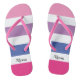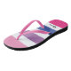 These fun flip flops are decorated with bold stripes of pink, purple, blue and white with black typography.