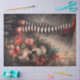 The composition uses an aged background with dripping paint effects, rich reds, warm neutrals, and antique textures for a dramatic gothic aesthetic. The striped stockings and red heels create a bold contrast against the skull and floral arrangement.