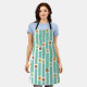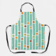 This apron has a 1970s retro design of blue stripes interrupted by circles in brown, orange and green.