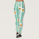These leggings have a 1970s retro design of blue stripes interrupted by circles in brown, orange and green.