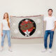 Beautiful Christmas holiday throw blanket features a cute red nosed reindeer on a background of grey with white diagonal stripes, a strip of solid black with a few white snowflakes, and a red centre with white polka dots.