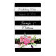 Chic wedding favour mini wine bottle labels, done in black and white horizontal stripe pattern. Lovely graphics of watercolor painted pink peonies, decorate the bottom of the label. Personalise the text for your guests. Great on bottles, for your wedding reception or as take home wedding favours.