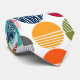 This necktie has a mid-century modern design of striped semicircles and solid semicircles put together on a field of white.