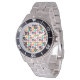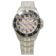 This men's watch has a mid-century modern design of striped semicircles and solid semicircles put together on a field of white.