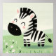 A playful zebra foal stands in a field of daisies, its stripes contrasting playfully against the vibrant green grass. The zebra's wide eyes and cheerful grin radiate pure joy and innocence. The artwork is rendered in a bright and cheerful colour palette, creating a sense of energy and optimism.