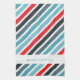 The colourful and happy kitchen towel design, by red_dress, features diagonal thick stripes printed on a white background - blue and red tones - and the words "Miguel's Kitchen" on a white customisable border.