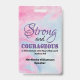 STRONG COURAGEOUS WOMAN Christian Conference Badge with inspirational message reading STRONG AND COURAGEOUS IS THE WOMAN WHO FEARS THE LORD which is based on Joshua 1:9. Mauve and black typography on cloudy pink and blue background. Ideal conference badge for Christian conferences - or perhaps as ID badges for your church groups, classes, motivational women's groups, etc. Matching gifts and resources available.
