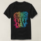 A vibrant and eye-catching t-shirt design featuring the phrase "Stronger Every Day" in bold, multicolored letters. The text is layered over a dynamic background of geometric shapes and abstract patterns, creating a sense of movement and energy.