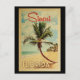A uniquely retro mid-century modern Stuart Florida art print in vintage travel poster style. It features a curved palm tree on sandy beach with ocean under a blue cloudy sky.