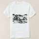 A vintage pen and ink style drawing of a vintage car stuck in the mud whilst driving across a field.