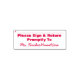 This corporate rubber stamp design features the message "Please Sign & Return Promptly To", and a line that a signature or initials could be written above. It also features a custom educator or tutor name. It could perhaps be be used by a teacher, tutor or educator to ask a student’s parent(s) or guardian(s) to review and acknowledge the grade that a student got on a project, a test, an essay, a paper, or some other school assignment.