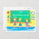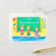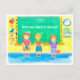 A fun "welcome back to school" postcard featuring three children in a classroom asked to stand in front of the class holding the letters to spell "cat illustrated with watercolor. You can customise the message to fit your needs.