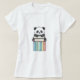 An adorable digital illustration featuring a scholarly panda cub resting comfortably atop a playful arrangement of books. The cheerful character smiles gently while leaning over two horizontal hardcovers, with a neat row of vertical spines in pastel shades of mint, pink, blue, and yellow supporting him from below. The artwork uses clean lines and a charming, cartoonish style to highlight the panda's friendly personality and the colorful literary setting.