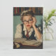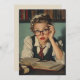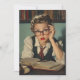 A young woman in vintage attire, wearing glasses, looks overwhelmed while studying at a desk filled with open books. The setting resembles a 1950s academic scene.