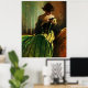 Study in Black and Green by John White Alexander (Pennsylvania 1856–1915). The idealised, impassive woman, shown as if she were a precious object was a painter favourite subject, Here, a young beauty is absorbed to pinning a bauble or blossom to the low neckline of her elegant evening gown. The skirt’s sinuous striped pattern, the curves at the knees and shoulders, and the contour of the upswept hair justify the description of Alexander as “the painter of the flowing line.” His dazzling brushwork is especially noteable in the rendering of the rich fabrics and in the otherwise plain background.