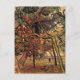 Study of Pine Trees by Vincent van Gogh is a vintage fine art post impressionism landscape nature painting. A forest with pine trees during the autumn season with beautiful colourful leaves on the ground. A man is walking in the distance.