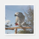 Pretty African Grey on a tree stand with her pretty grey feathers and red tail watching her surroundings outdoors against the blue sky and oak trees.