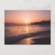Stunning photograph of a sunset over a deserted beach with mountains and palm trees in the distance.