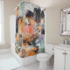 a strong and bold abstract collage on a shower curtain... wonderful painterly fragments of modern artwork. orange and coral, black, wine, aqua and lavender.