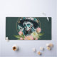 Stunning woman adorned with a stunning sugar skull makeup. The bright colours and intricate patterns tell stories of life and death, giving her a cheerful yet respectful look that is perfect for Día de los Muertos. Her long, flowing hair glows a brilliant turquoise that flows over her shoulders like a waterfall of colour. It catches the light and enhances the festive mood of the design. The background glows in deep blues and greens reminiscent of a night sky, while delicate pink and white flowers dance around her. These floral accents not only add colour, but also symbolise love and remembrance of the deceased.