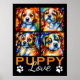 This is a cute poster perfect for a dog lover featuring 4 adorable stylised puppies in vibrant colours and the words "Puppy Love" with dog paws.