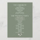 Are you a fan of the Mediterranean and its rich culture? Do you want a wedding program that captures its essence and reflects your personality? Then you will love this option. This program has a green background with a round frame that contains your initials and a lovely illustration of olive branches. The olive branches symbolise peace and harmony, which are perfect for your special day. On the back of the card, you will find all the details about the ceremony and reception, along with the same olive branch motif.
