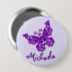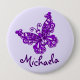 Beautiful stylised purple butterfly inked art button/badge. Personalise with your own name, currently reads Michaela. Butterfly inked by Sarah Trett.