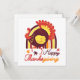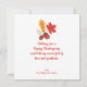 A colourful greeting card with elegant typography "Happy Thanksgiving" text, and a cute turkey with a colourful rainbow and some autumn leaves. The card includes a wonderful greeting message at the back which can be personalised.