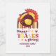 A colourful wine label with elegant typography "Happy Thanksgiving" text, and a cute turkey with a colourful rainbow and some autumn leaves. The label includes a script name and year which can be personalised.